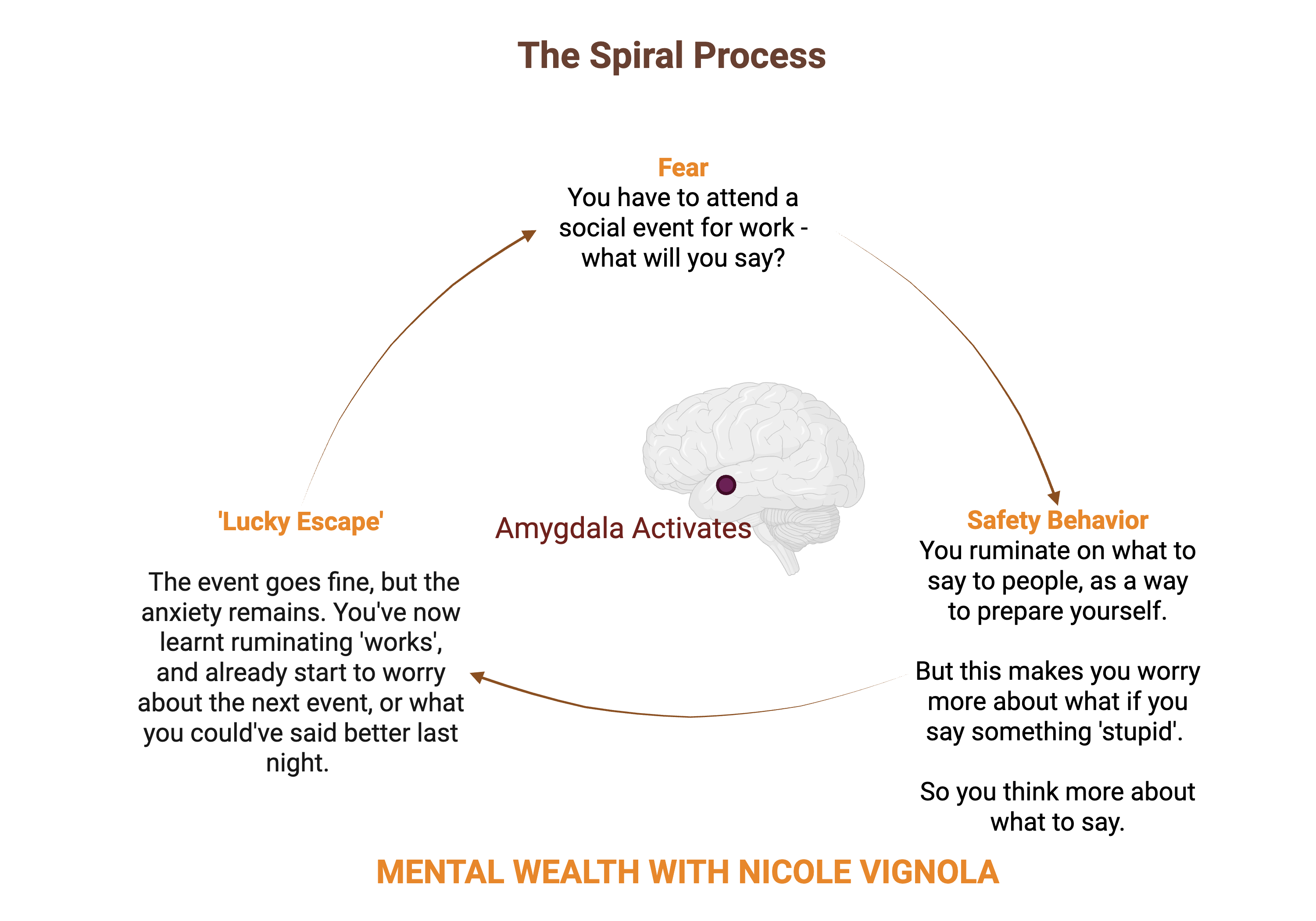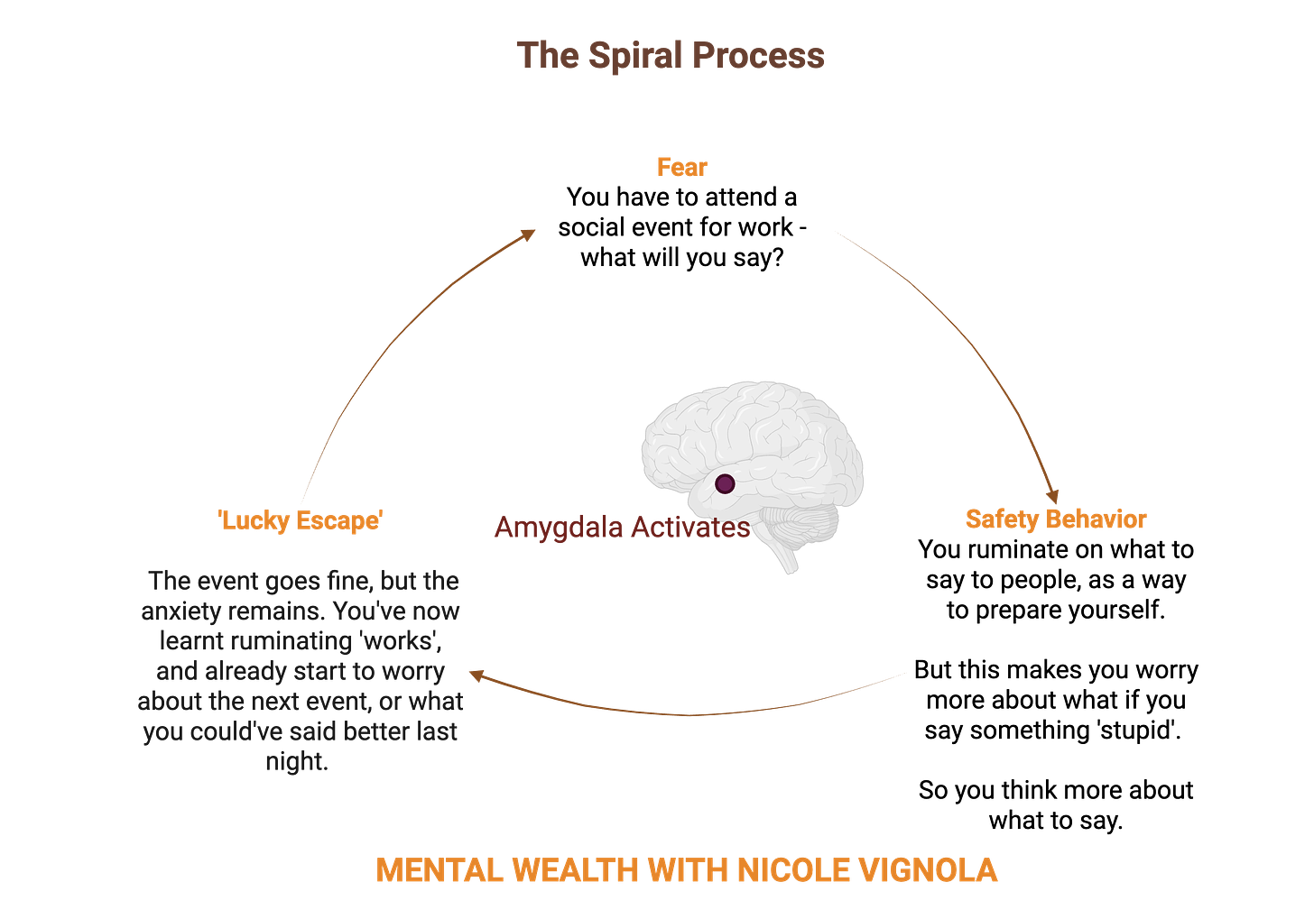 This is generally an anxiety-driven process where you continually think about an issue that you fear/are Ûanxious about/are stressed about, coming to no resolution. And because spiraling is driven by fear (from a brain area called the amygdala), you’re not really looking for a solution either. The rational, problem-solving part of the brain (the frontal cortex) isn’t engaged (1). Spiraling can masquerade as a helpful process - ‘thinking things through’- whereas it’s really a cycle that’s perpetuating the anxiety. The thoughts start to be less grounded, and more ‘what if’ based.